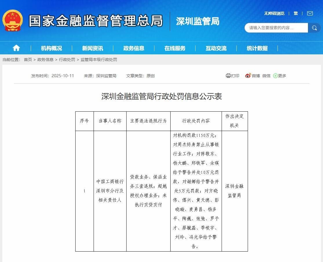 东说念主民网深圳10月13日电 (刘森君)10月11日,深圳金融监管局公示最新罚单,中国工商银行深圳市分行被罚金1150万元,主要坐法违纪活动波及贷款业务、保函业务三查违纪;卓越授权办理业务;未推行实贷实付。