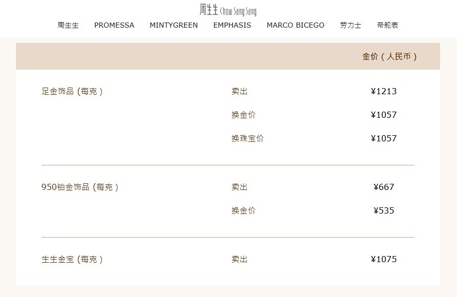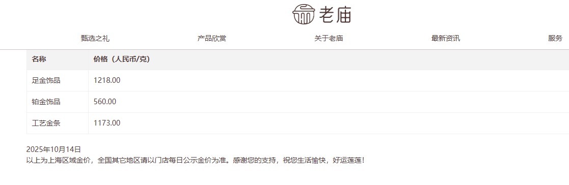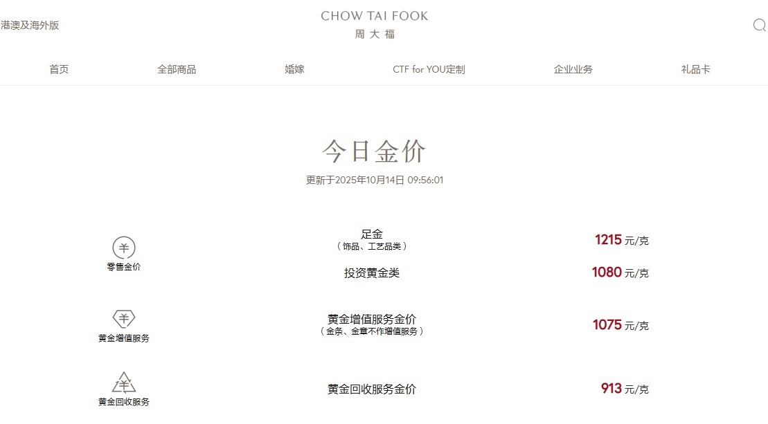 10月14日,查询各大黄金品牌官网发现,周大福足金(饰品、工艺品类)价钱从1190元/克涨至1215元/克,一日上升25元;周生生从1188元/克涨至1213元/克。老庙黄金足金饰品价钱也来到1218元/克。从9月14日到10月14日,仅一个月的时间,周大福、周生生金价涨超130元/克。