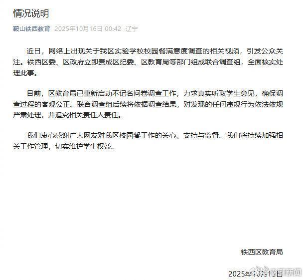 辽宁省鞍山市铁西区考验局微信公众号10月16日发布情况评释称,铁西区委、区政府立即责成区纪委、区考验局等部门构成连合访问组,全面核实处理此事。当今,区考验局已再交运转不记名问卷访问责任,勤快果然听取学买卖见,确保访问经过的客不雅平允。连合访问组后续将依据访问恶果,对发现的任何违游记为照章依规严肃处理,并讲求猜度连累东谈主连累。(据10月16日澎湃新闻)